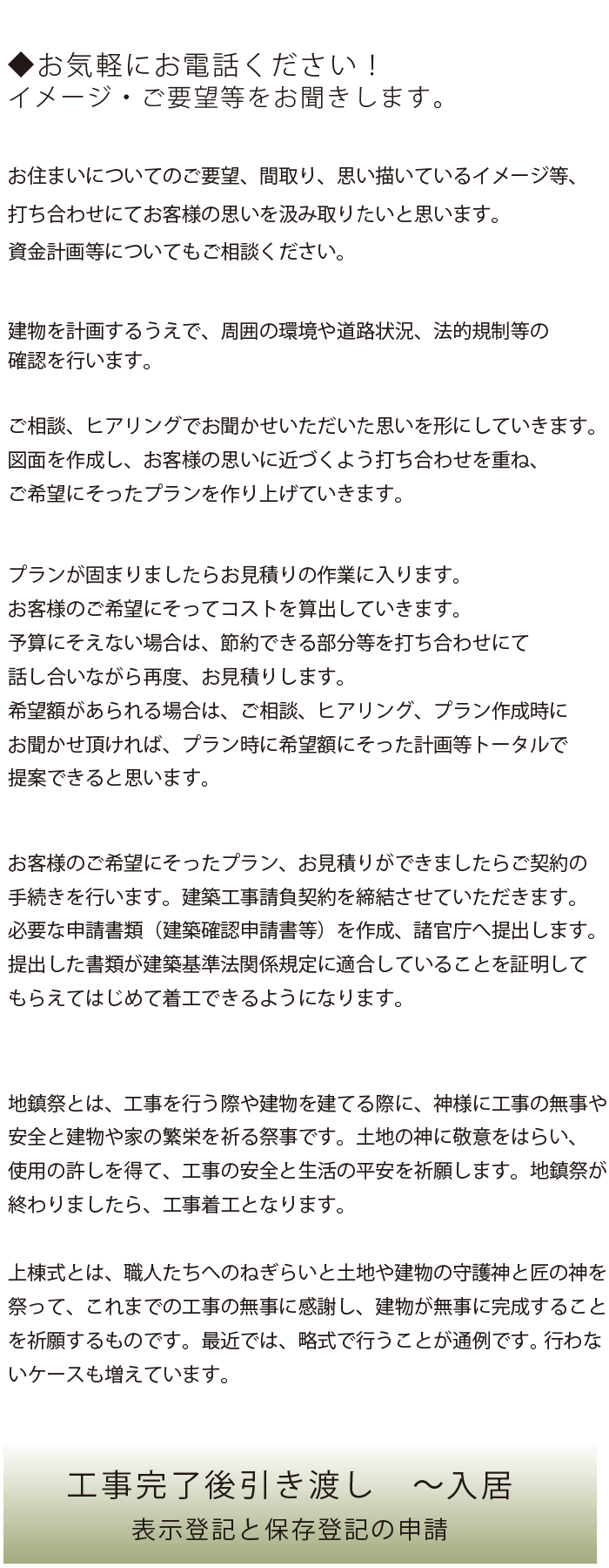 いい仕事をするには、すべての職業において人としての 「心・気・習慣」が必要だと思います。人としての「心得」を日々の生活の中で実践していきながら、長い歴史の中で日本の風土に育まれてきた 建築を学び、 その技術や考え方を現代の住宅に活かすことが最も重要なことだと考えております。 強さと優しさを兼ね備え、住みやすさをも追求して、職人粋を昇華させた現代の生活スタイ ルにあった 「ぬくもり」ある安全、安心な「家づくり」を目指します。